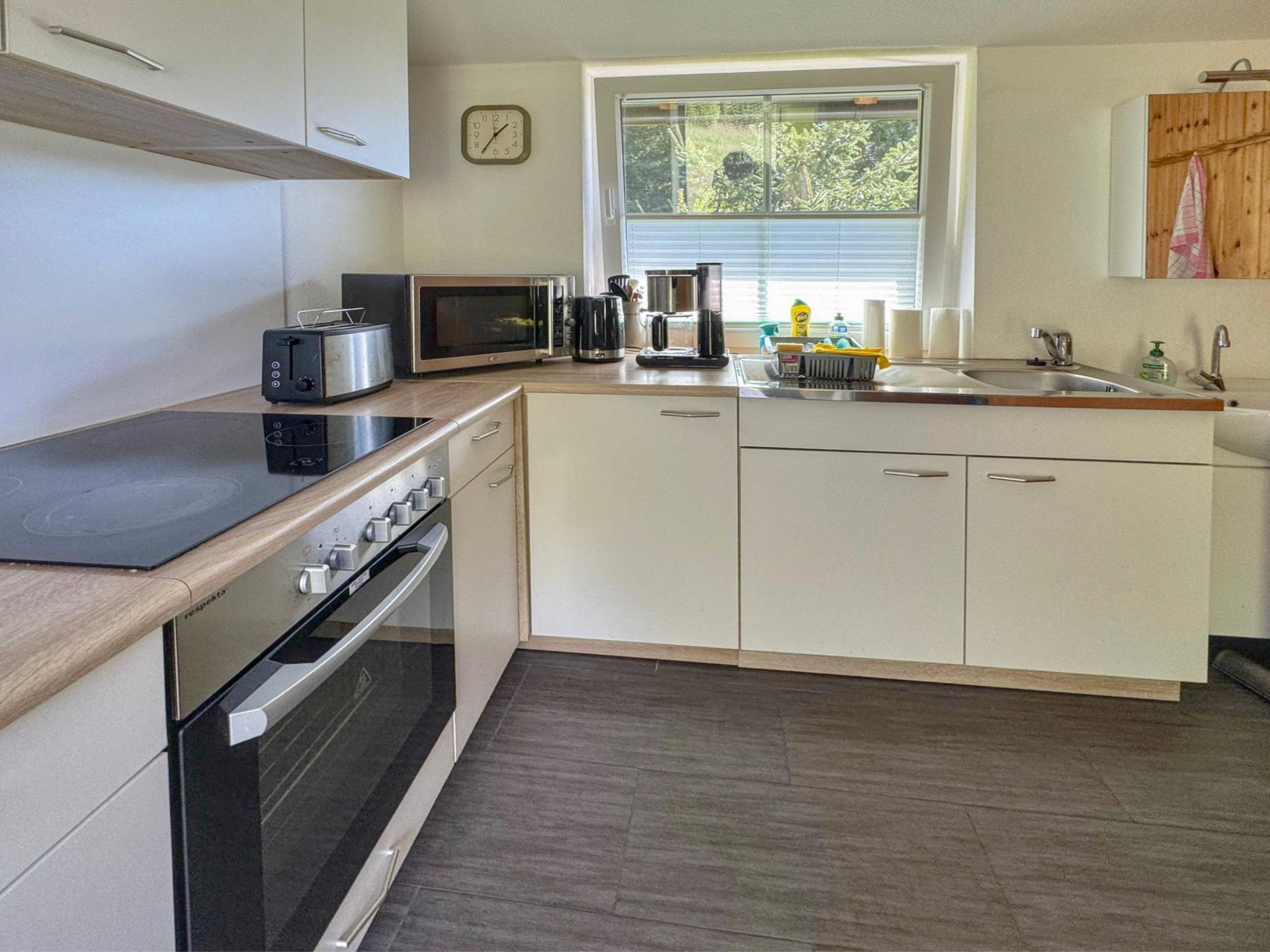 Op de 1e etage: woonkamer met 2-pers. slaapbank, TV(flatscreen), eettafel, kachel(Pellet), radio , keuken met waterkoker, broodrooster, fornuis(3 kookplaten), afzuigkap, koffiezetapparaat(filtermaling), oven, magnetron, koelkast(+ vriesvak)