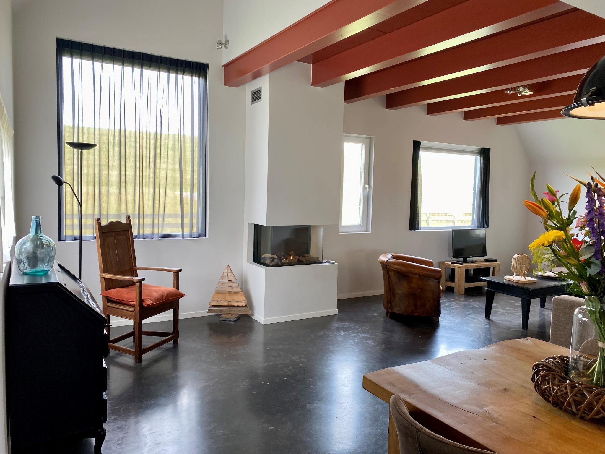 Begane grond: hal(vloerverwarming) met wc , open keuken(vloerverwarming) met waterkoker, fornuis(4 kookplaten, inductie), afzuigkap, koffiezetapparaat(filtermaling), combimagnetron, afwasmachine, koelkast(+ vriesvak) , woon/eetkamer(vloerverwarming) met TV(flatscreen), eettafel(6 personen), sfeerhaard, zithoek(6 personen) , slaapkamer met badkamer(vloerverwarming) met 2-pers. bed(2 x 1 persoons dekbed, synthetisch, 2 x 1 persoons hoeslaken, 90 x 200 cm), douche, wastafel , toilet, wasruimte met wastafel, stofzuiger, strijkplank, strijkijzer , 1x kinderstoel