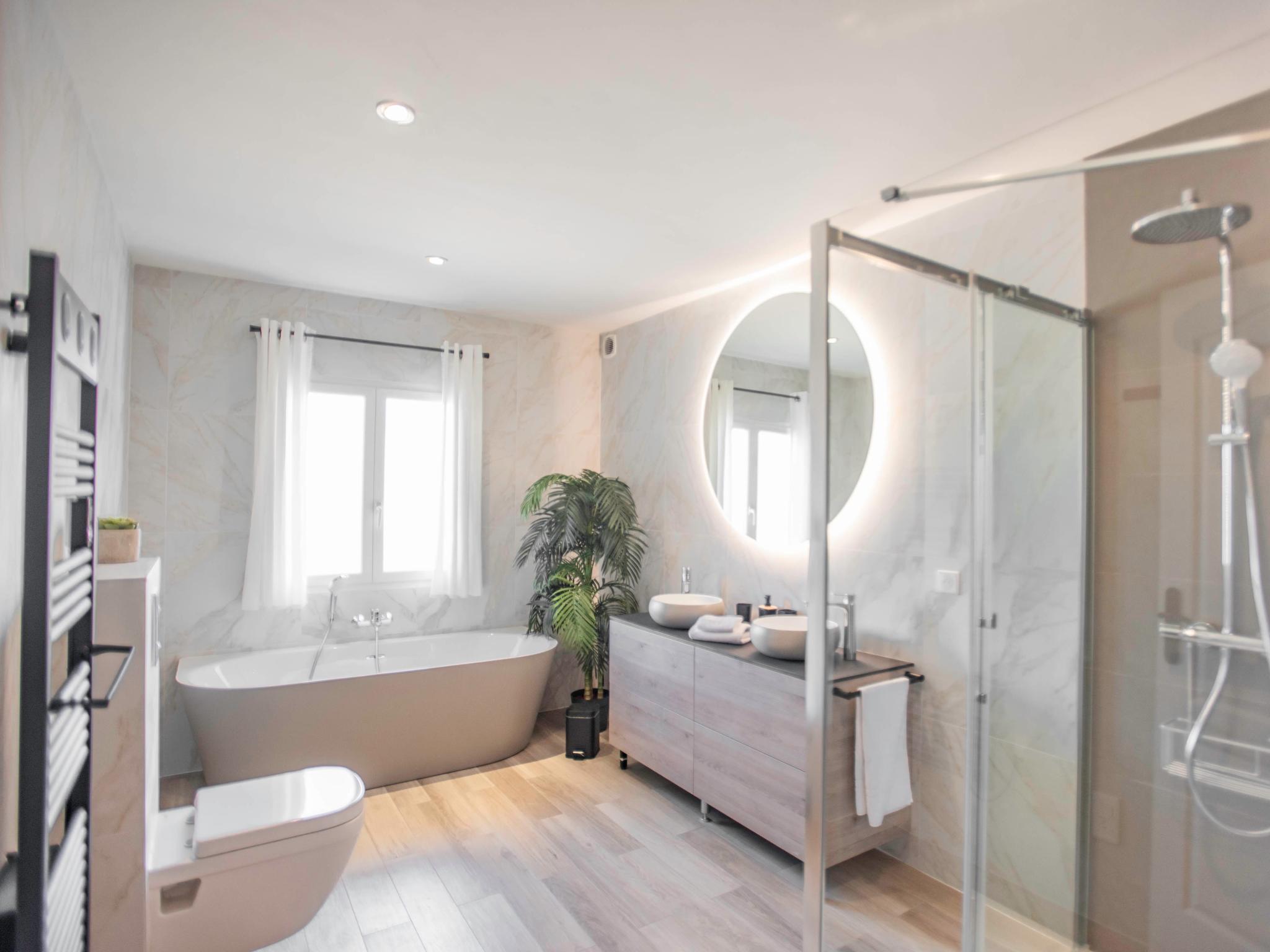 Op de 1e etage: hal met wc , keuken met waterkoker, broodrooster, fornuis(4 kookplaten, inductie), afzuigkap, koffiezetapparaat(cups, pads), oven, magnetron, afwasmachine, koel-/vriescombinatie, Staafmixer , woon/eetkamer met TV(kabel, flatscreen, internationale zender(s)), eettafel(8 personen), sfeerhaard, zithoek, DVD-speler, airconditioning , slaapkamer met 2-pers. bed(boxspring, 180 x 200 cm), airconditioning , slaapkamer met 2-pers. bed(180 x 200 cm), airconditioning , badkamer met ligbad, douche, 2x wastafel, wc , badkamer met douche, wastafel , balkon of terras