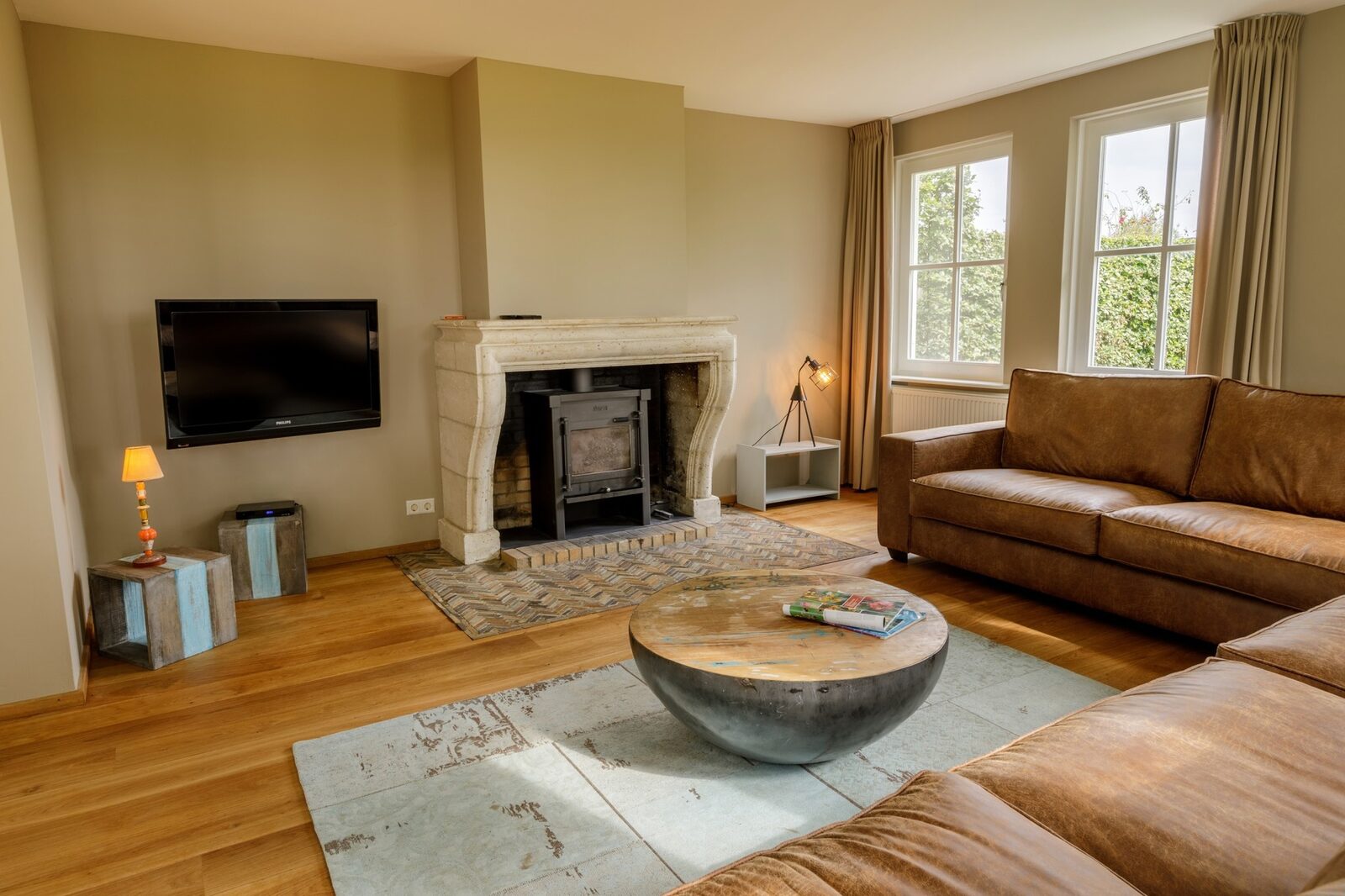 Woonkamer met tv, muziekbox en zitgedeelte met houtkachel.