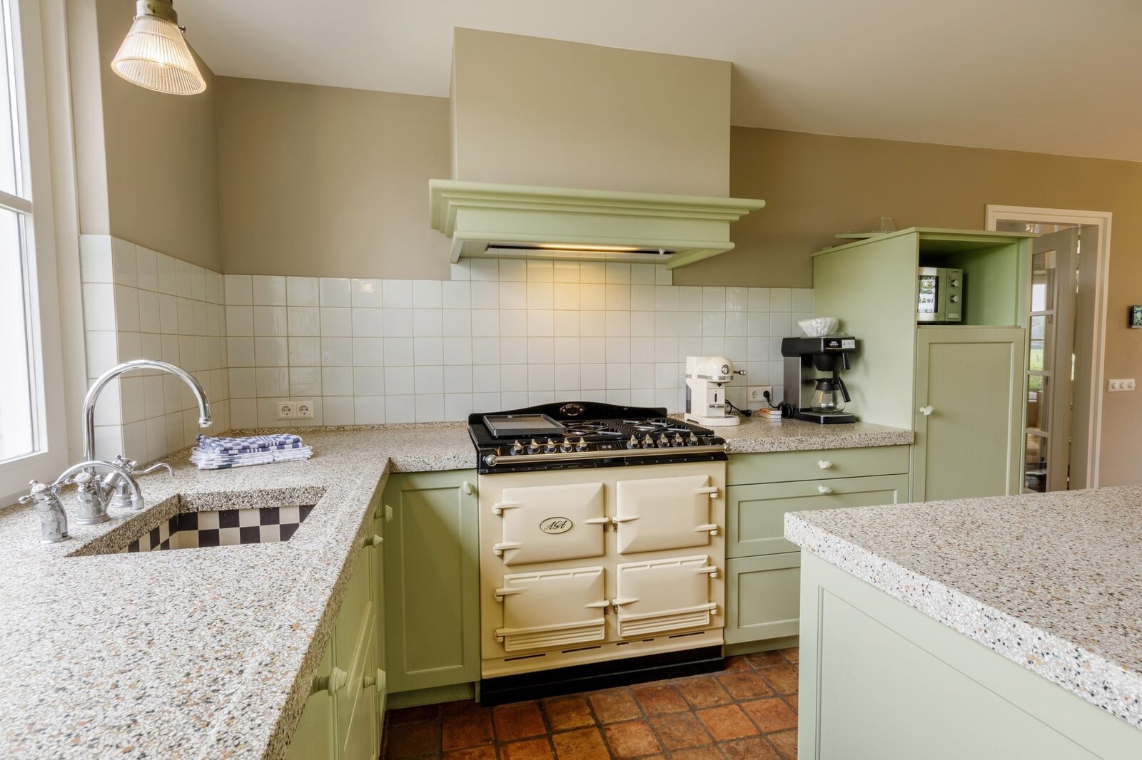 Aparte keuken met AGA fornuis met 6 gaspitten, grote koelkast, oven, magnetron, vaatwasser, Nespresso-machine, filterkoffiezetapparaat en waterkoker. Lange eettafel en houtkachel.