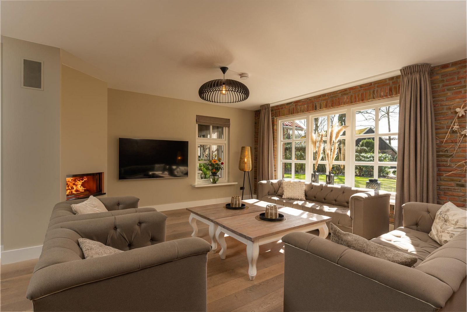 Woonkamer met zithoek en eethoek met flatscreen tv, open haard en eettafels.