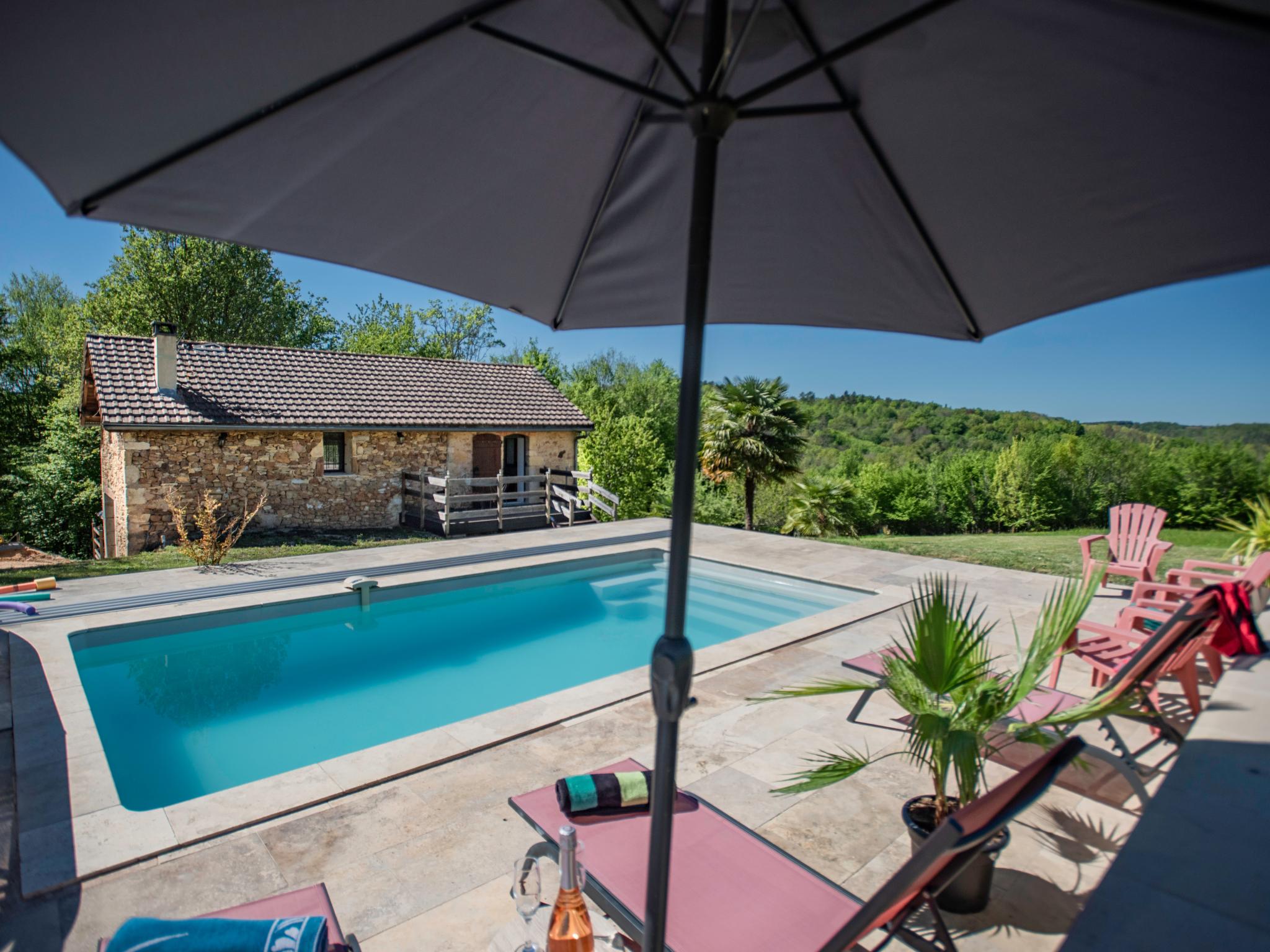 Ontsnap naar dit typische huis in de beboste Dordogne, perfect voor een vakantie met z’n vijven. Met een privé overdekt zwembad en een hectare grond heb je hier alle rust en privacy die je nodig hebt-geen buren, geen inkijk, alleen natuur. Het huis heeft twee slaapkamers: één met een kingsize bed (180×200) en één met een tweepersoonsbed (140×200) en een eenpersoonsbed (90×200), ideaal voor een gezin met drie kids