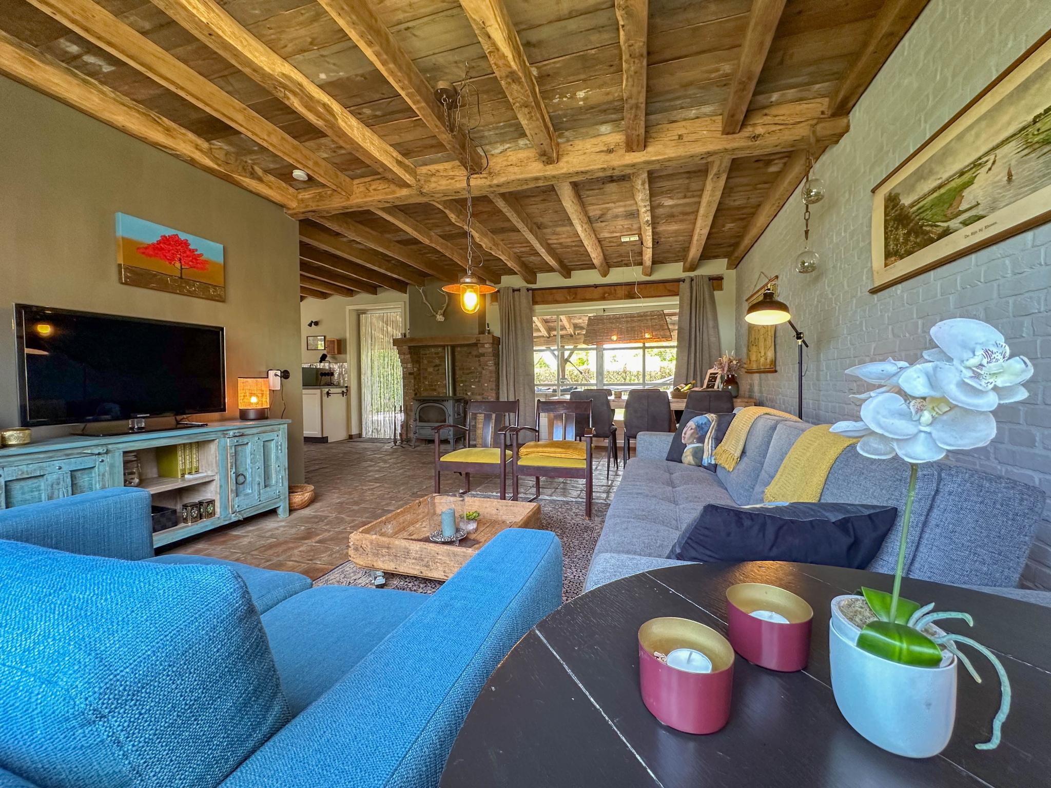 Begane grond: hal, open keuken met waterkoker, fornuis(4 kookplaten, gas), afzuigkap, koffiezetapparaat(cups), oven, grill, magnetron, afwasmachine, koelkast, vriezer , woon/eetkamer met TV(smart TV, Nederlandse zender(s), Duitse zender(s)), eettafel, open haard, zithoek, radio, 1x kinderstoel, gezelschapsspellen , badkamer met douche, wastafel, wc