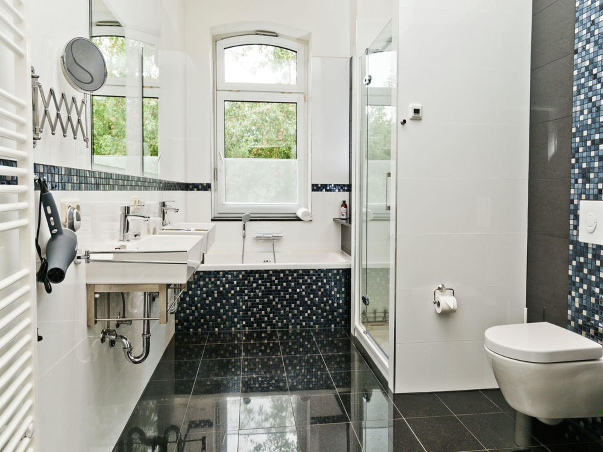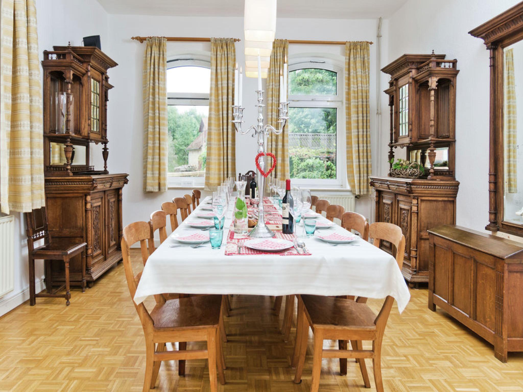 Begane grond: gang, woonkamer met TV(flatscreen, smart TV, Duitse zender(s)), kachel(hout), zithoek(12 personen) , eetkamer met eettafel(16 personen) , keuken met kookplaat(4 kookplaten, inductie), kookplaat(1 kookplaat, inductie), kookplaat(2 kookplaten, inductie), waterkoker, broodrooster, afzuigkap, koffiezetapparaat(cups, filtermaling, pads, bonen), oven, grill, magnetron, afwasmachine, koel-/vriescombinatie, Blender, Staafmixer, Keukenmachine , slaapkamer met 1-pers. bed(90 x 200 cm) , badkamer met douche, wastafel , toilet, zaal met tafeltennistafel , beamer