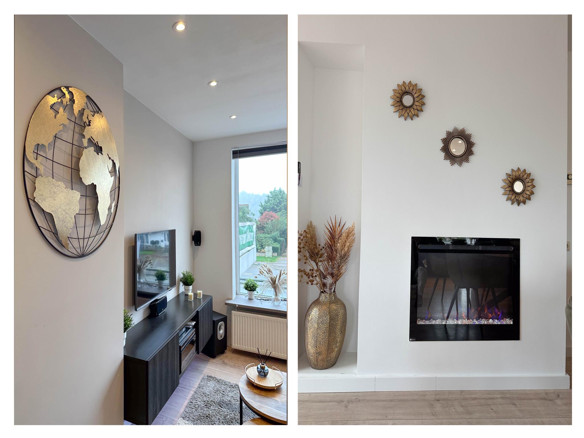 Op de 1e etage: hal, keuken met waterkoker, fornuis, afzuigkap, koffiezetapparaat(filtermaling, pads), afwasmachine, koelkast, vriezer , woon/eetkamer met TV, eettafel, sfeerhaard, zithoek, airconditioning , toilet met wc , bijkeuken met wasmachine